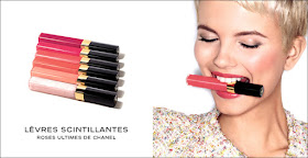 Just in time for Valentine's Day Chanel has released "ROSES ULTIMES DE CHANEL". It is a wonderful, dazzling collection of pink and coral Glossimers and nailpolishes for the lips and nails. There are six Glossimers and four nailpolishes that are available with this collection and it is currently available at Chanel.com.